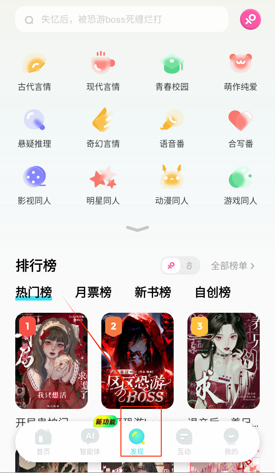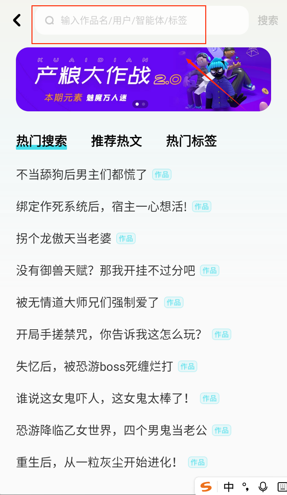4、如果想找特定内容,用顶部搜索框输入书名,比如绑定作死系统后宿主一心想活,智能体会帮你推荐类似作品。