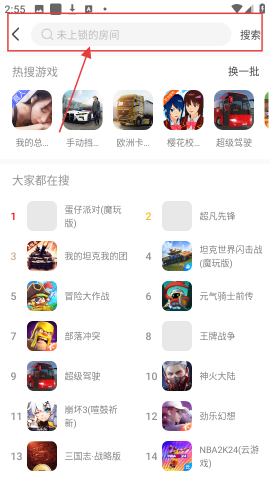 1、在软件首页,点击顶部搜索框,可进入搜索页面,准备搜索游戏啦。