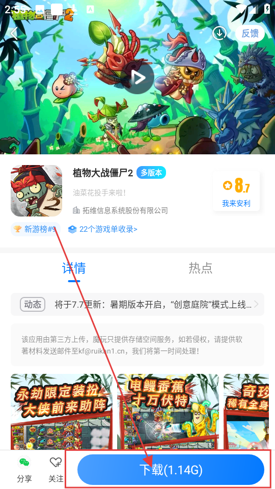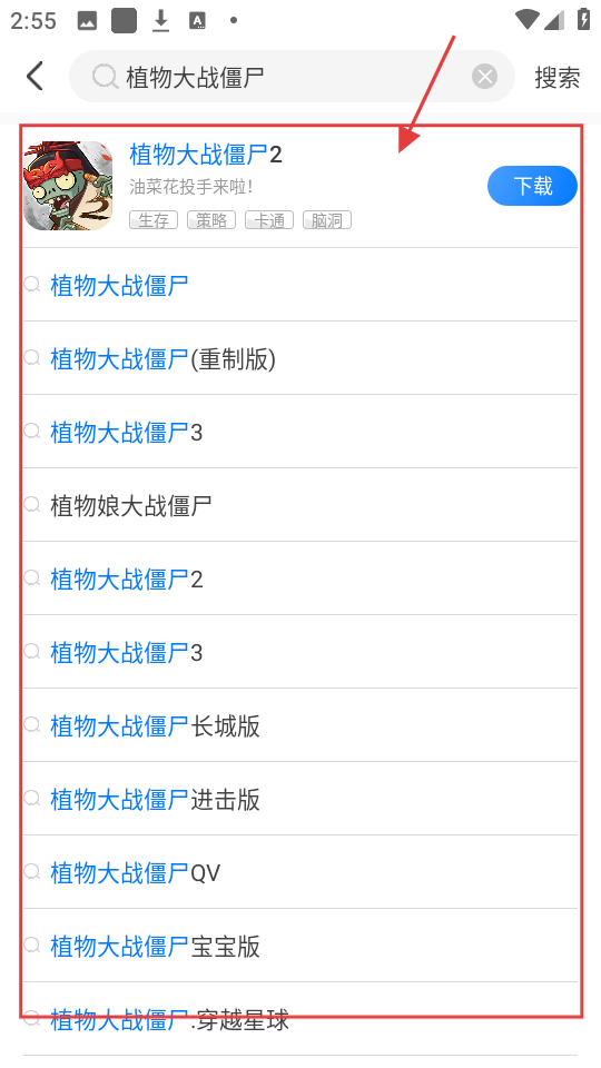 3、在搜索建议中,点击【植物大战僵尸2】,可进入该游戏详情页,了解游戏信息啦。