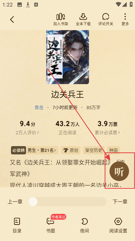 1、打开小说阅读页面,找到【听】按钮,点击它,开启听书模式,准备调节语速啦。