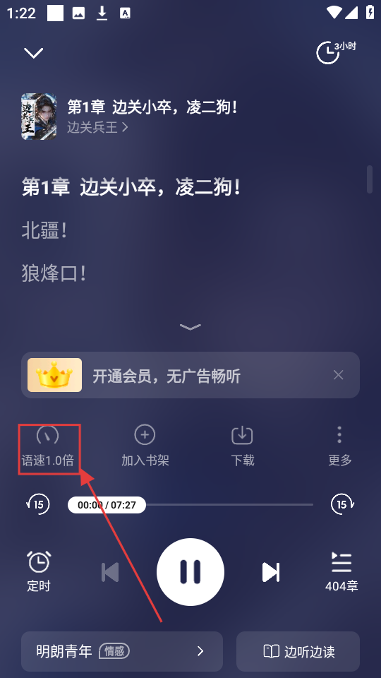3、进入听书界面,这里可以任选一个章节听,还有给听书时间定时、调语速以及加入书架的功能