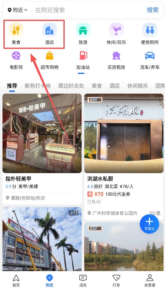 2、想找附近吃喝玩乐,就点击底部附近选项,页面上会分类展示美食、酒店、便民厕所等,直接点选感兴趣的类型。