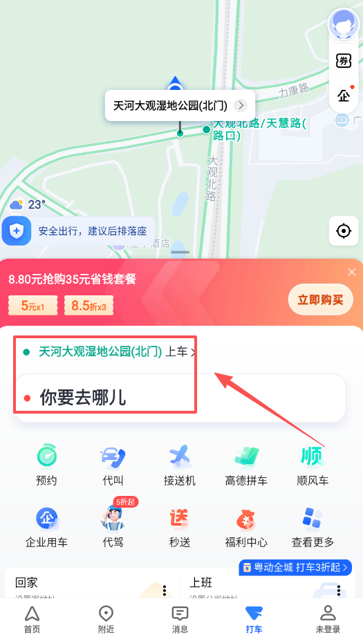 3、需要打车时,在主界面或打车页输入起点与终点,高德会同时展示实时打车、拼车、顺风车等多种选项和预估费用。