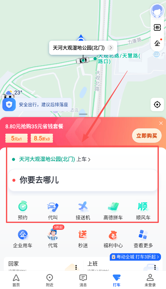 3、打车时除了即时呼叫,还可以使用预约或接送机等特色服务,在打车页面能找到这些选项,出行更从容有把握。