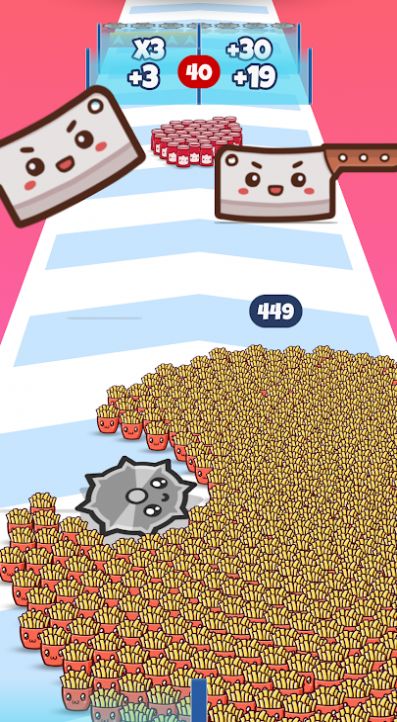 《食物收集跑》是一款很有趣的冒险游戏,我们将会带领着自己的美食军队去进行趣味的冒险,要小心游戏里面那些陷阱,那会导致我们的数量减少的,灵活的去进行移动,队伍人数会清晰的为大家去进行展示,看看你能不能在食物收集跑里面完成自己的挑战吧,这还是很有意思的。