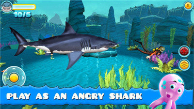 2、游戏的目的是控制鲨鱼在海底,吃小鱼或其他海洋生物来生存,你也可以和大螃蟹战斗。