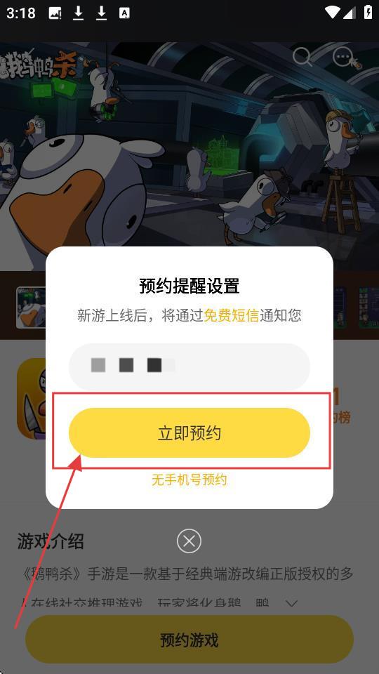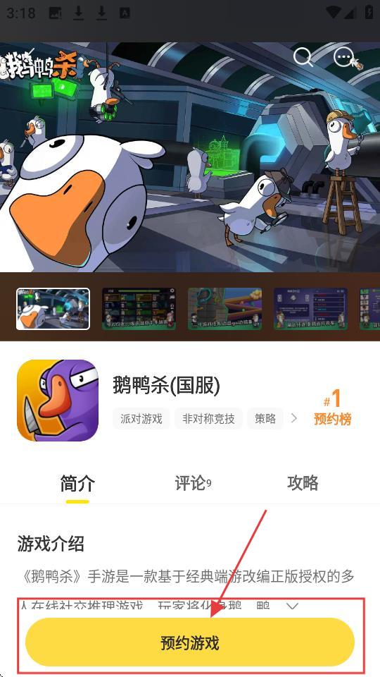 3、进入【鹅鸭杀(国服)】详情页,看到下方的【预约游戏】按钮,点击它就能进行游戏预约啦。