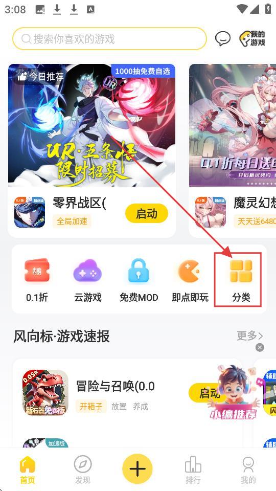 1、打开APP,点击【分类】按钮,进入游戏分类页面,可开始筛选游戏啦。