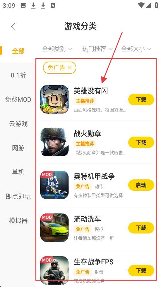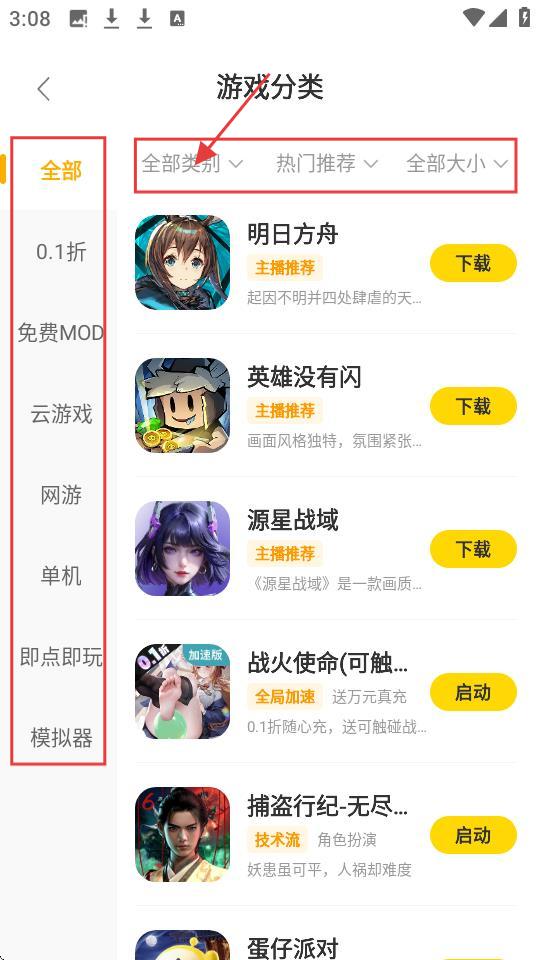 2、在游戏分类页面,利用顶部的类别、推荐、大小等筛选条件,缩小游戏查找范围哦。