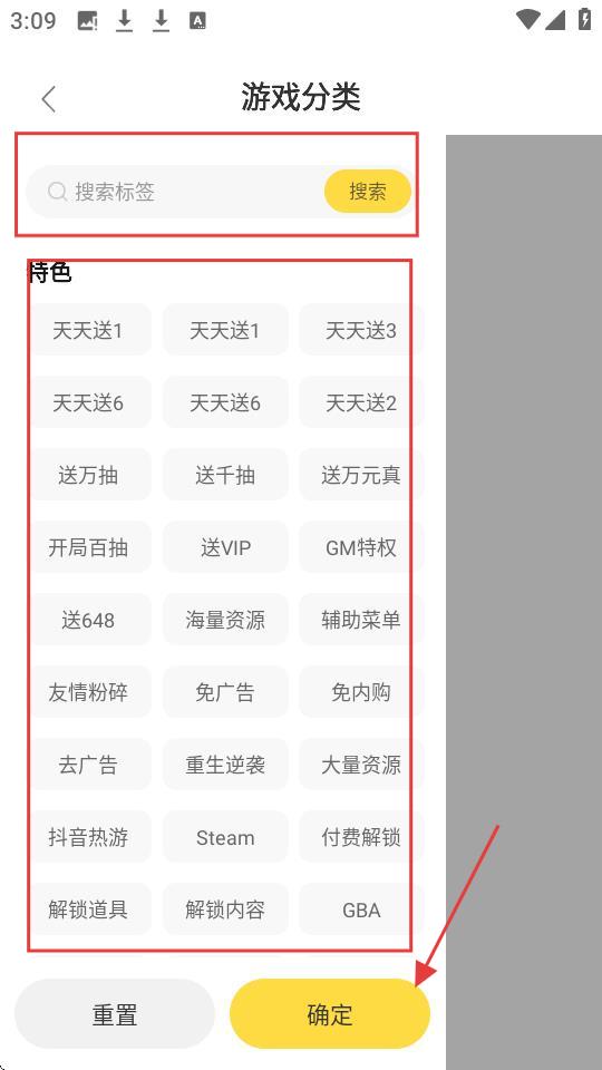 3、还可通过搜索标签或选择特色标签,如【免广告】等,进一步精准筛选游戏,选好后点击【确定】吧。