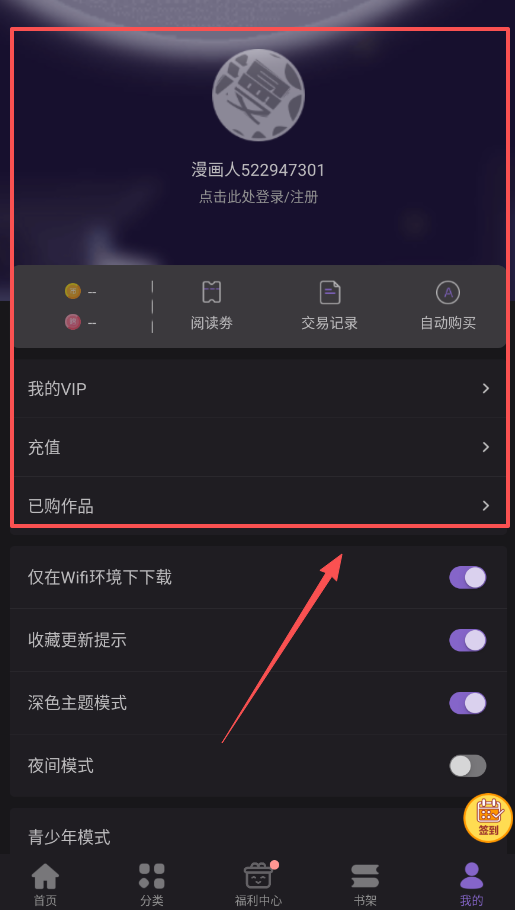 1、首先进行账号登录与个性化设置,点击页面上的登录或注册入口,成功进入后可以在“我的”页面管理阅读券和交易记录。