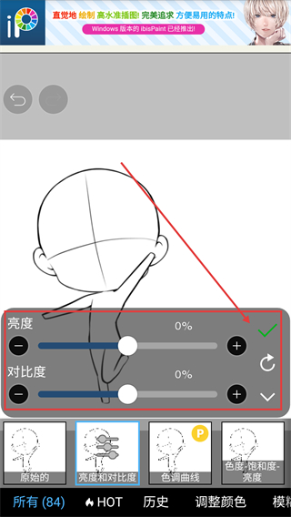 4、选择【亮度和对比度】滤镜后,拖动滑块调整参数,满意后点击确认就能应用该效果啦。