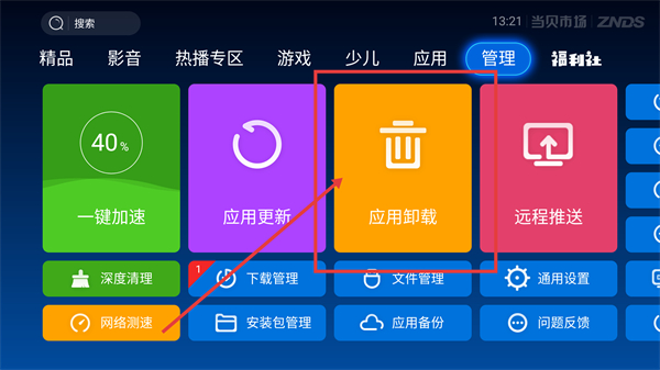 2、在管理页面选择【应用卸载】功能,就能进入应用卸载的操作界面,准备清理不需要的应用哦。