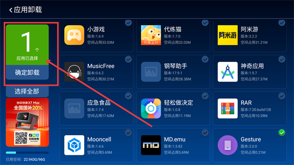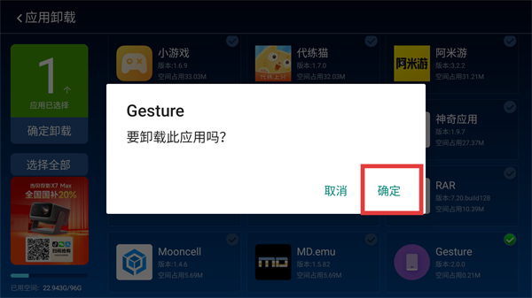 3、在应用卸载界面勾选要卸载的应用后,点击左侧的【确定卸载】按钮,就能触发卸载确认弹窗啦。