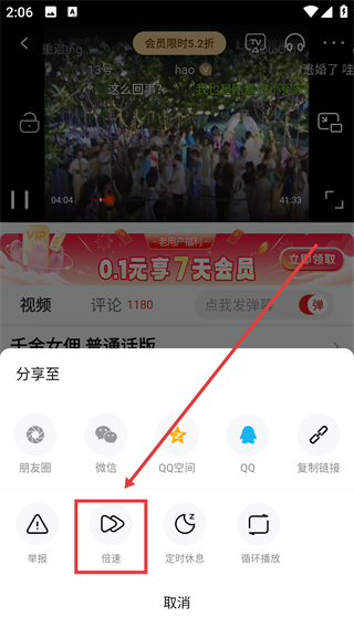 3、在弹出的菜单里点击【倍速】选项,就能打开倍速选择界面,调整剧集的播放速度啦。