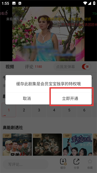 3、点击缓存后会弹出提示框,显示缓存是会员特权,可选择【立即开通】去解锁会员权益哦。