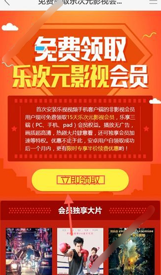 2、在下图中,点击【立即领取】后,注册登录乐视帐号,就可马上领取会员。