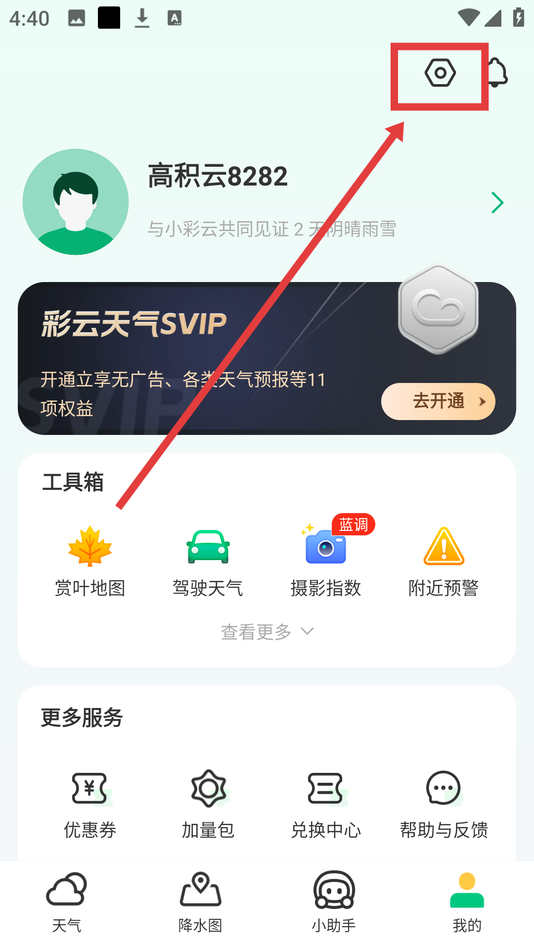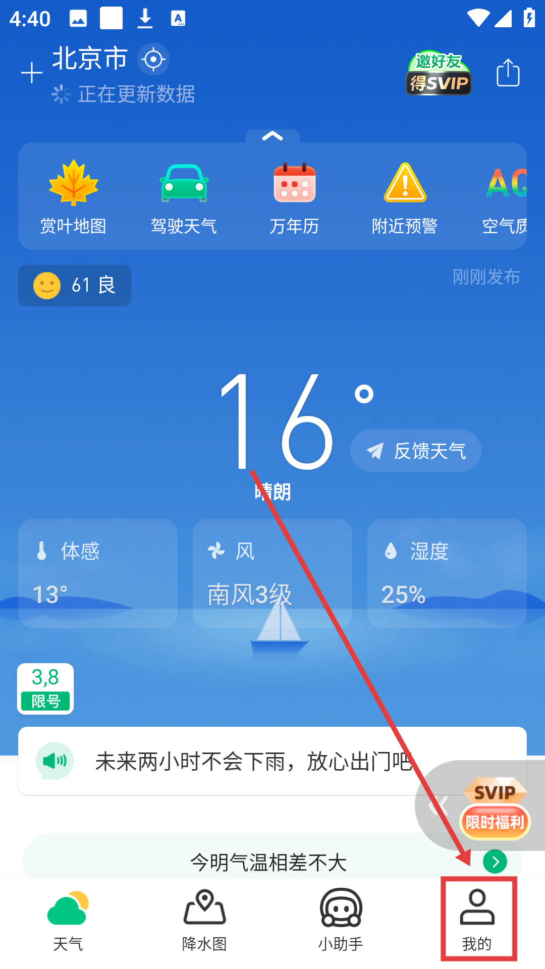 1、在天气APP首页,点击底部【我的】,可进入个人中心页面,准备进行天气提醒订阅设置啦。