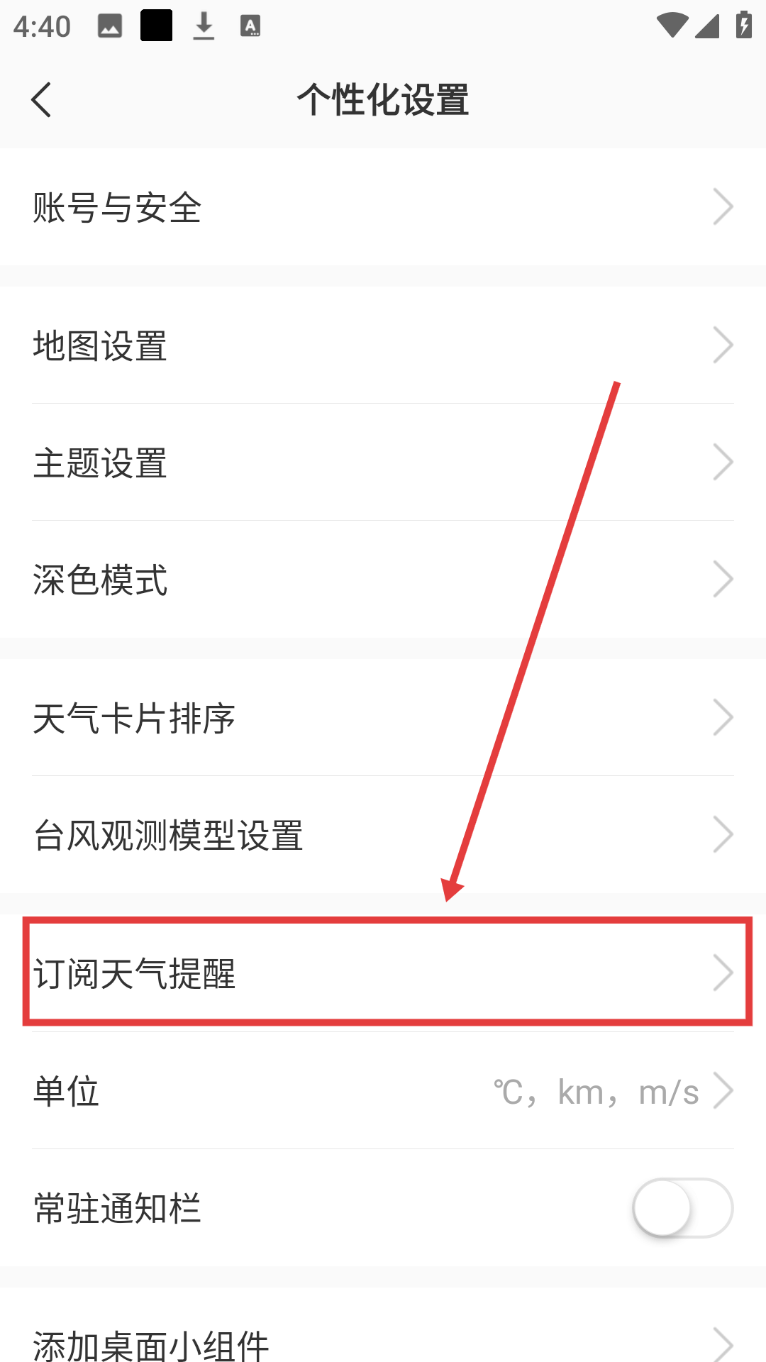 3、在个性化设置页面,点击【订阅天气提醒】,可进入提醒设置页面啦。