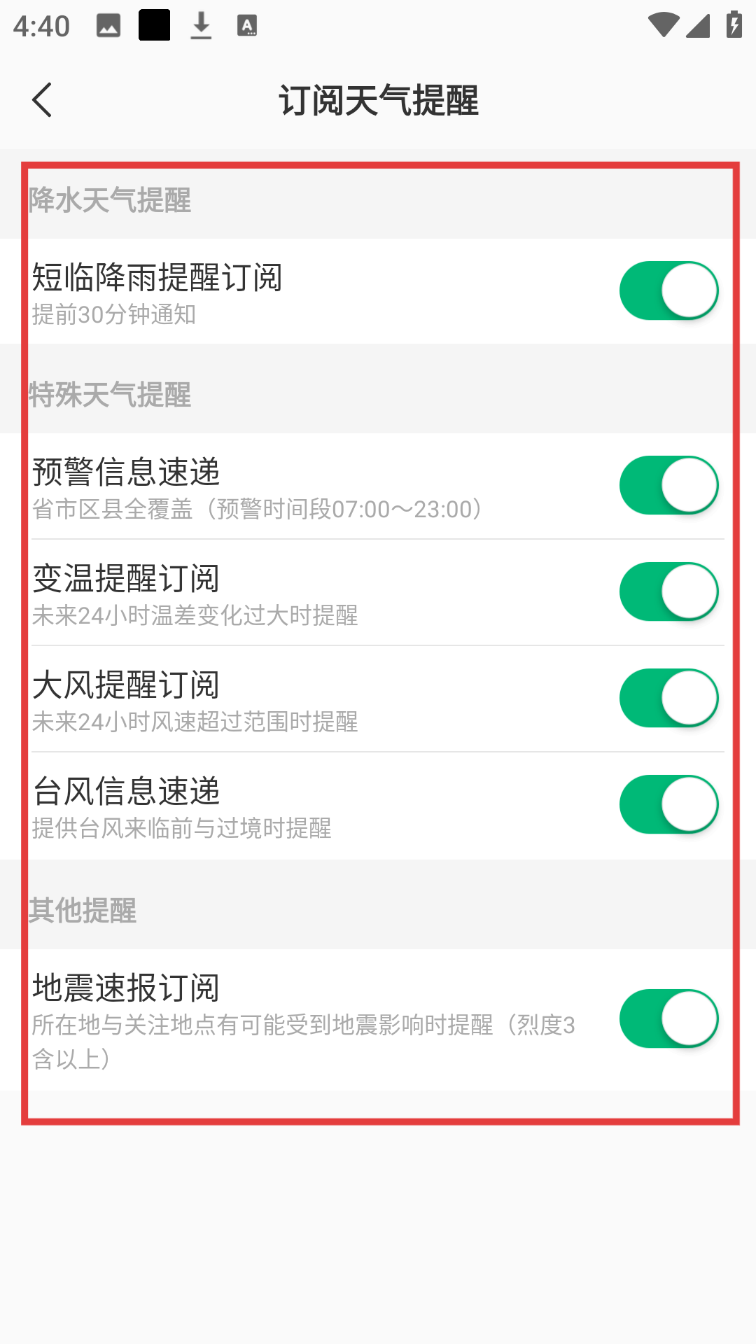 4、在订阅天气提醒页面,可开启短临降雨、预警信息等各类天气提醒,及时掌握天气变化哦。