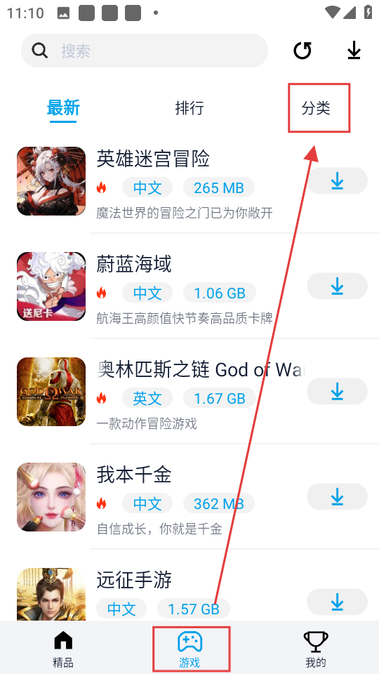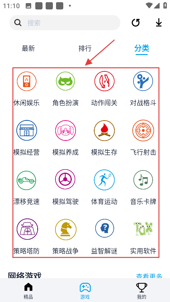 1、在“游戏”页面点击【分类】,进入游戏分类页面,开始挑选游戏哦。