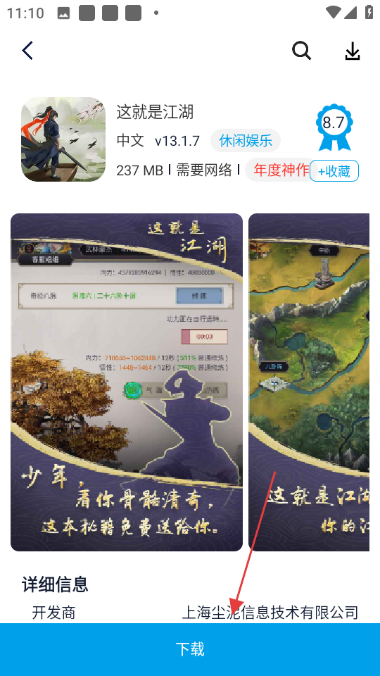 4、进入游戏详情页后,点击【下载】,就能开始下载《这就是江湖》,超简单的呢。