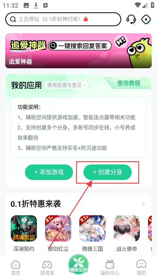2、进入辅助空间页面后,找到【+创建分身】按钮,点击它就能开始创建游戏分身啦。