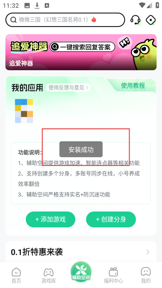 4、导入完成后,会显示“安装成功”,这样游戏分身就创建好啦,能在辅助空间里使用啦。