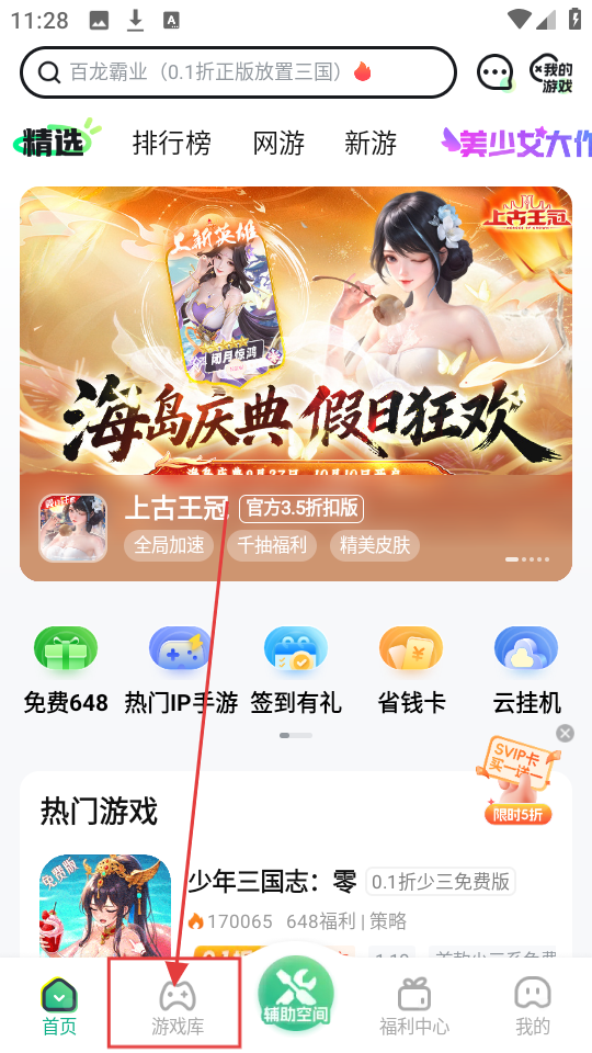 1、我们在软件首页,能看到搜索框和各类游戏推荐,点击底部的【游戏库】,就能进入游戏库页面啦。