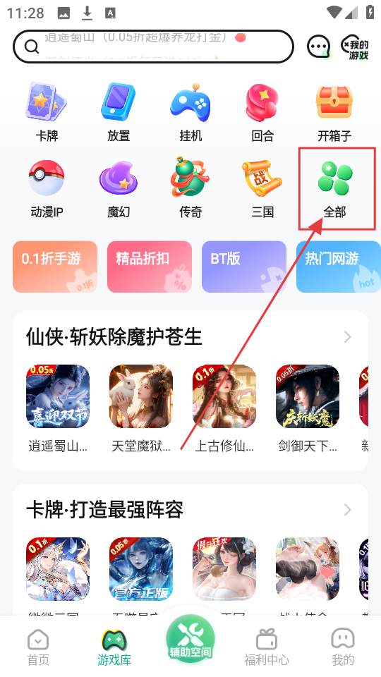 2、进入游戏库页面后,有卡牌、放置等游戏分类,我们点击【全部】,就能查看全部分类的游戏啦。