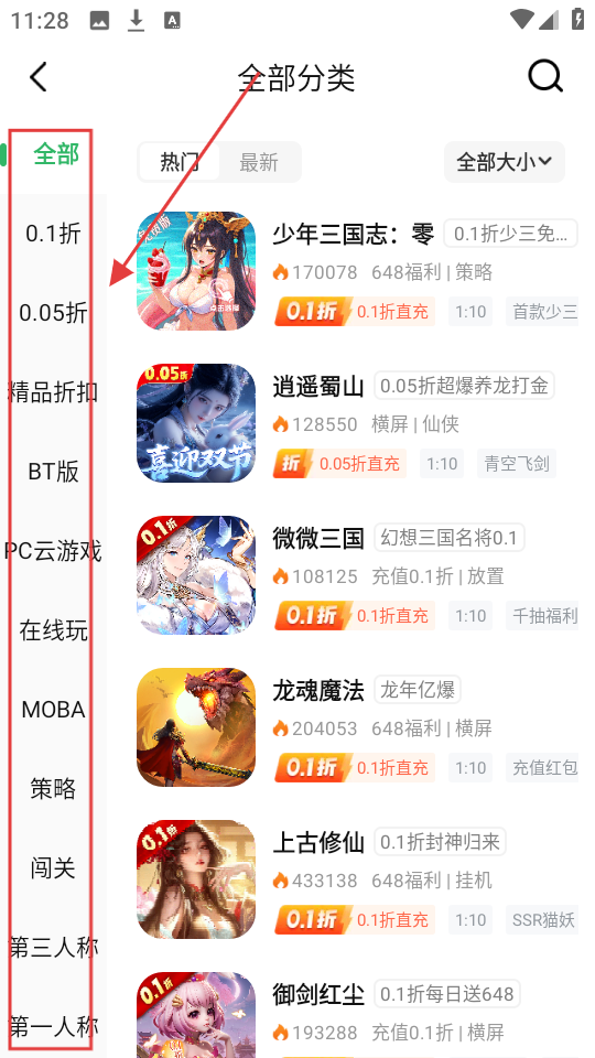 3、进入全部分类页面后,左侧有0.1折、0.05折等分类,我们可以选择感兴趣的折扣分类来筛选游戏。