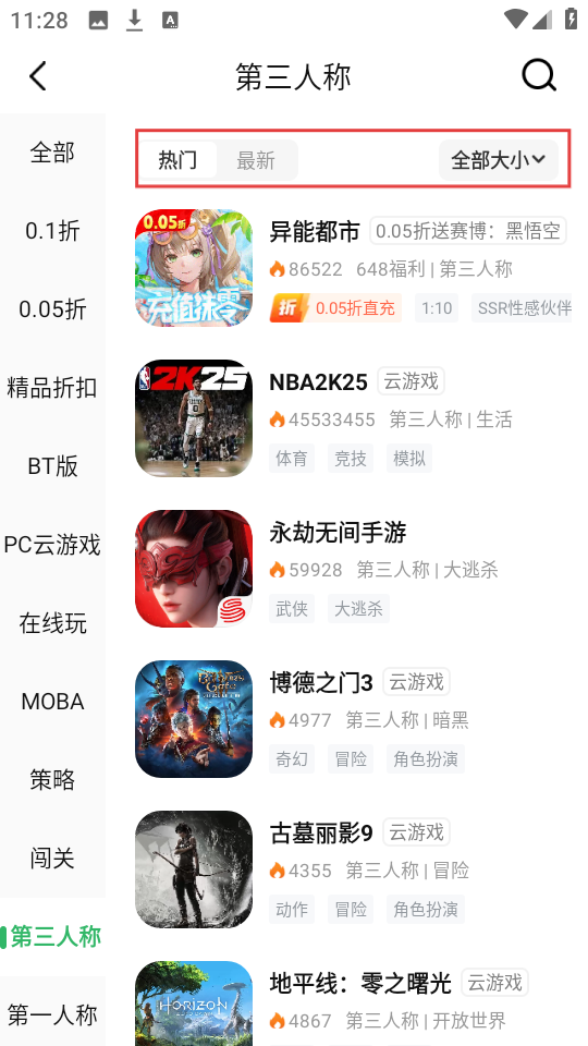 4、比如选择“第三人称”分类,进入后可以按热门、最新等排序,还能筛选游戏大小,方便找到想玩的游戏。