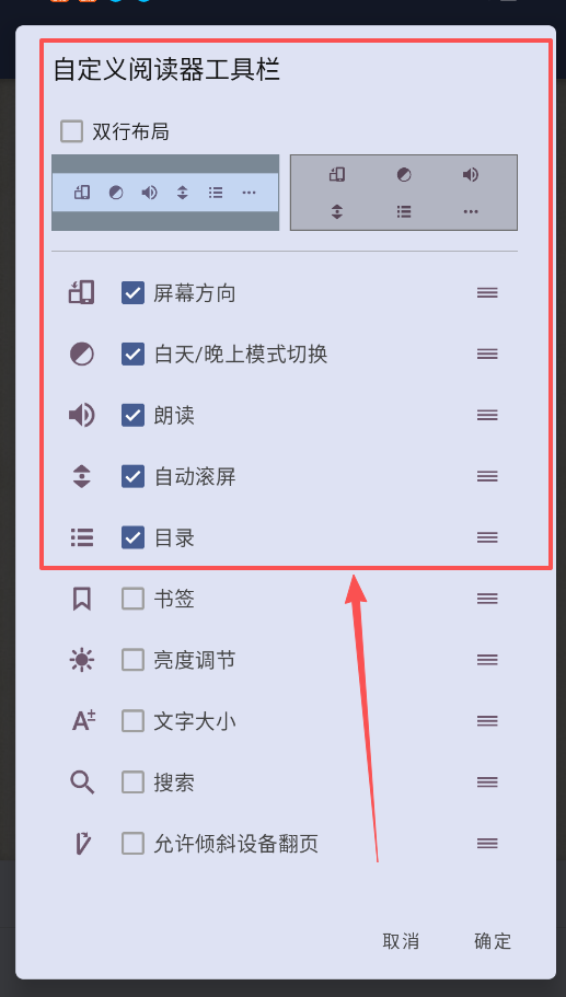 3、为了提升阅读效率,务必在设置中启用双行布局,并将日夜模式切换、亮度调节等常用工具放在顺手的位置。