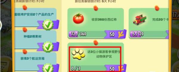 1、首先玩家在游戏中的【农场通行币】中的常规任务是需要完成送三位游客参观野生动物。