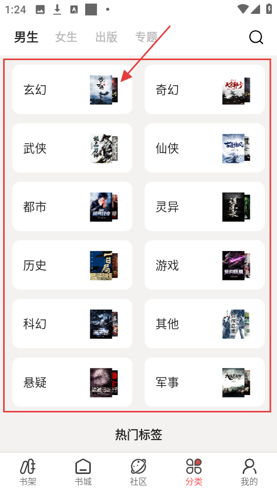 1、在分类界面选择喜欢的小说类别,如【武侠】,可进入该类别小说列表哦。