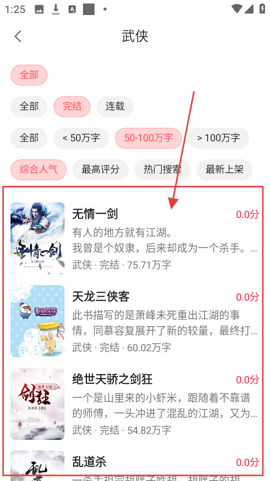 2、在武侠类别界面可通过筛选条件,如字数、状态等,找到心仪的小说啦。