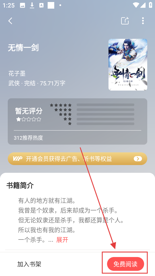 4、在小说详情界面点击【免费阅读】,即可开始阅读小说,沉浸在武侠世界啦。