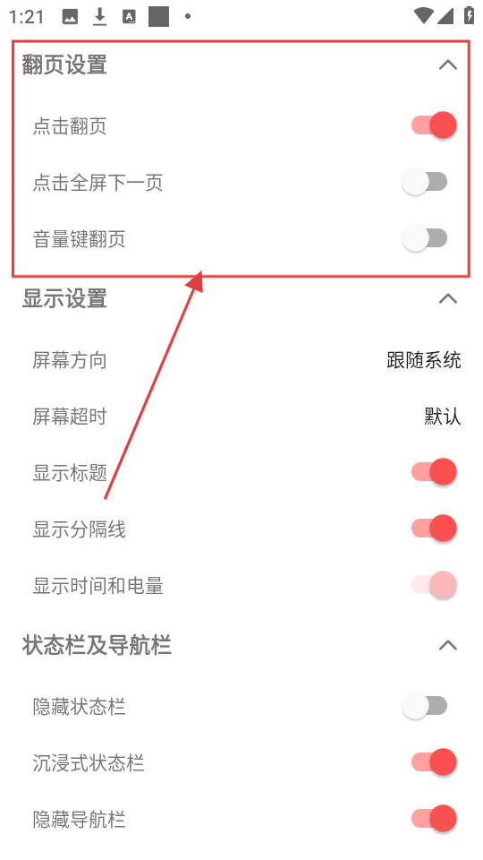 4、在设置页面,可调整翻页设置等,如点击翻页、音量键翻页等,根据喜好设置即可哦。