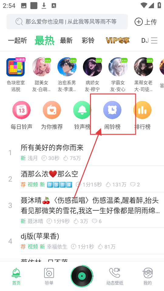 1、打开APP,在首页点击【闹铃榜】,进入闹铃榜单页面,查看热门闹铃铃声啦。