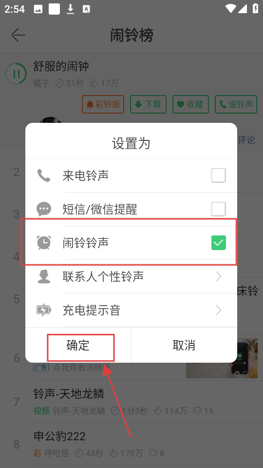 4、在设置选项中,勾选【闹铃铃声】,再点击【确定】,这样就成功将铃声设为闹铃啦。
