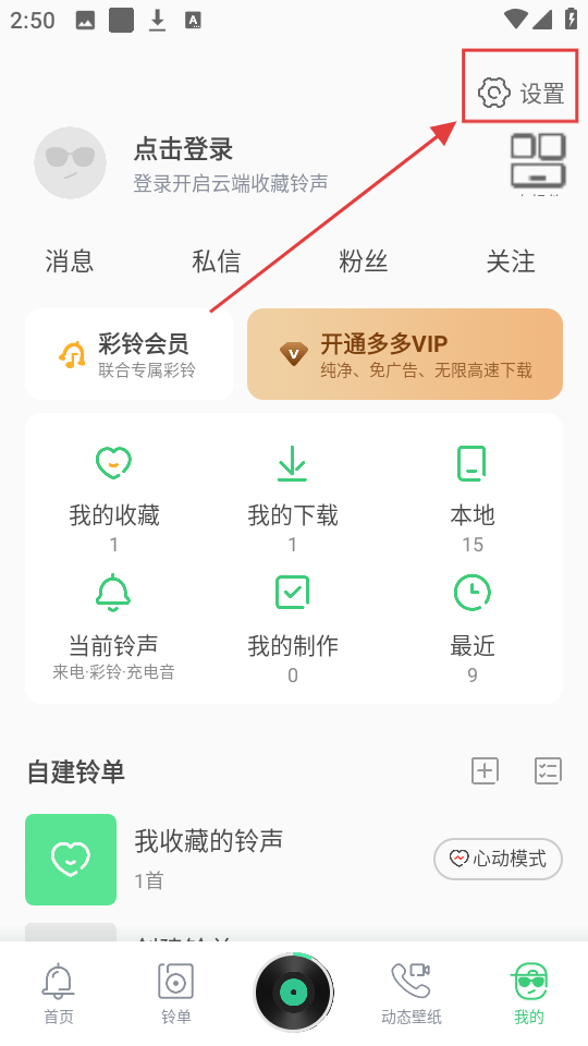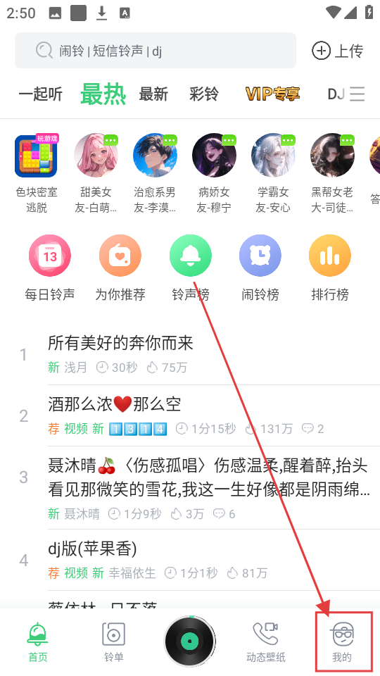 1、在首页能听到各类热门铃声,若想进行个人相关设置,就点击右下角【我的】,进入个人页面。