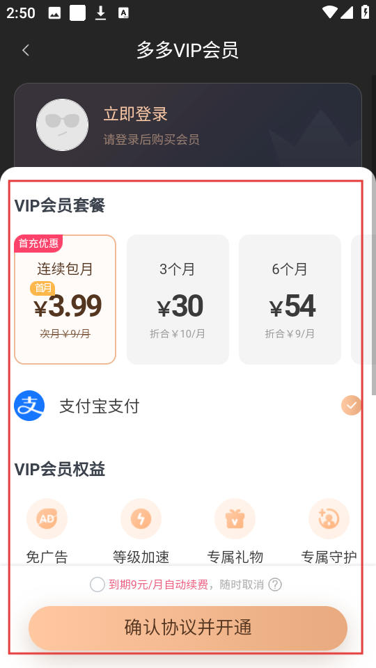 4、点击后会进入会员开通页面,可选择连续包月等VIP会员套餐,开通后就能享受免广告等权益。