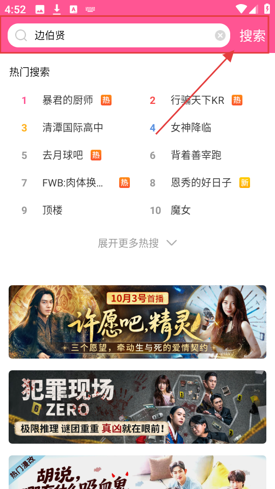 2、在搜索框输入明星名字,比如“边伯贤”,点击【搜索】,就能找到相关内容啦。