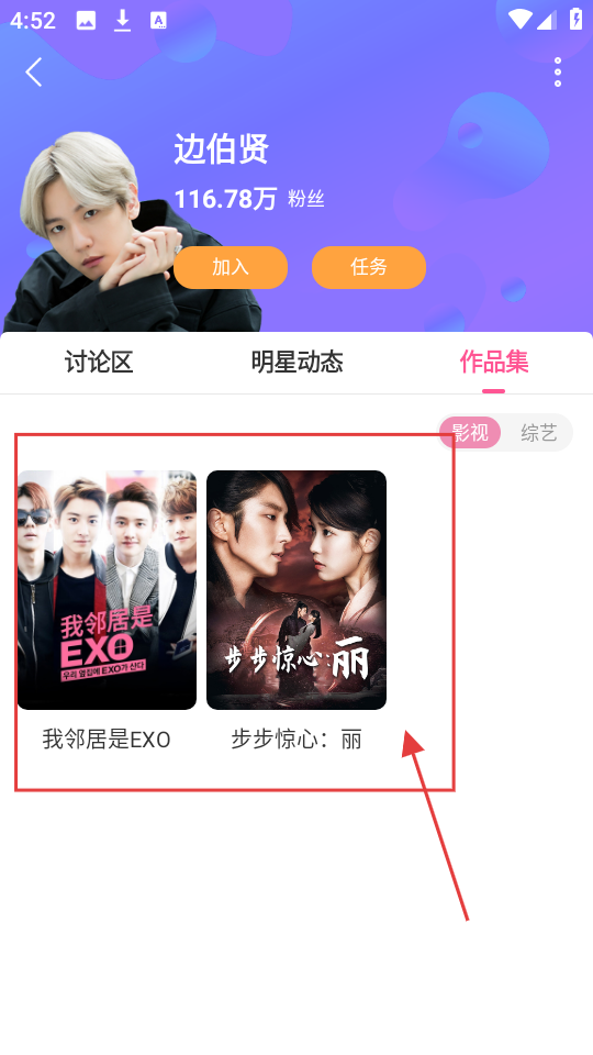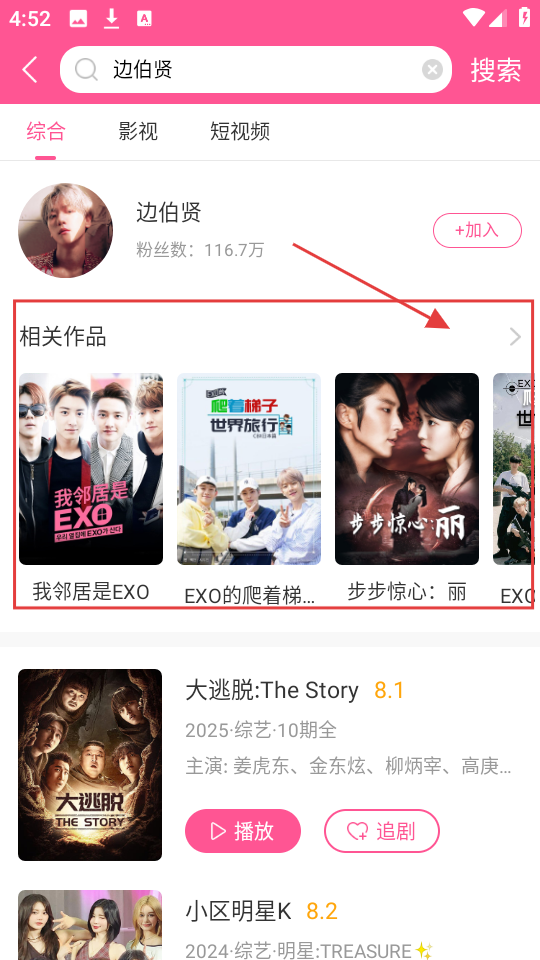 3、搜索结果出来后,能看到明星的相关作品,像《我邻居是EXO》等,可挑选想看的作品哟。