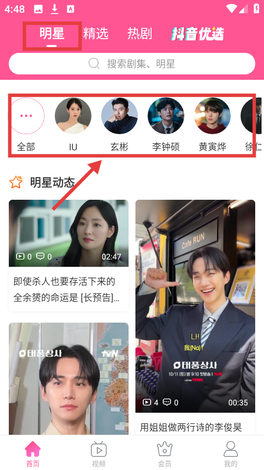 1、在应用首页,切换到【明星】分类,能看到IU、玄彬等明星,方便找到喜欢的明星呢。
