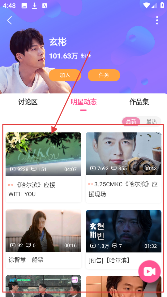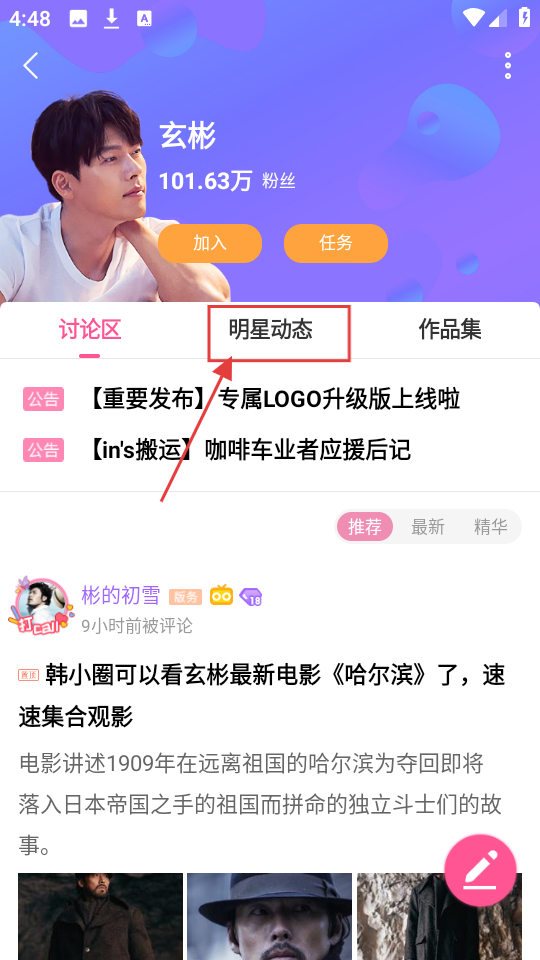 2、进入明星主页,比如玄彬的主页,点击【明星动态】,就能看到关于他的动态内容啦。