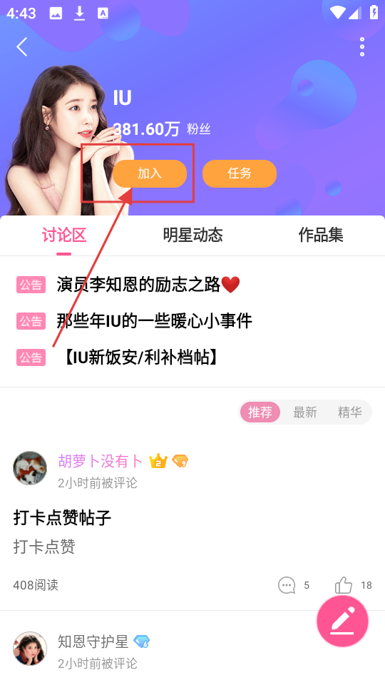 3、到了演员主页,比如IU的主页,看到【加入】按钮,点击就能关注演员,获取TA的动态啦。