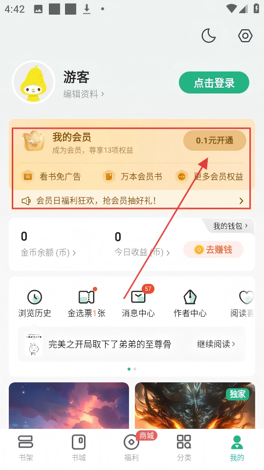 2、0.1元开通会员是超值投资,立刻解锁免广告特权并畅读会员书库,对于经常阅读的用户来说性价比极高,能大幅提升使用幸福感呀。