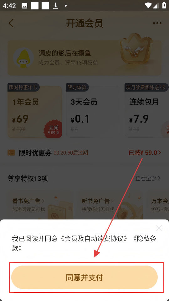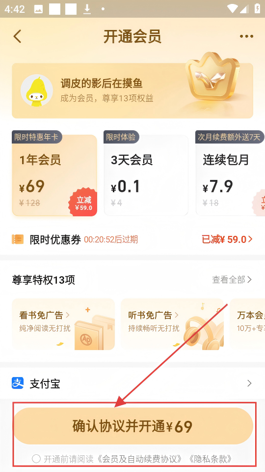 3、在开通会员页面,选好会员时长,点击【确认协议并开通¥69】,就能进入支付确认环节。