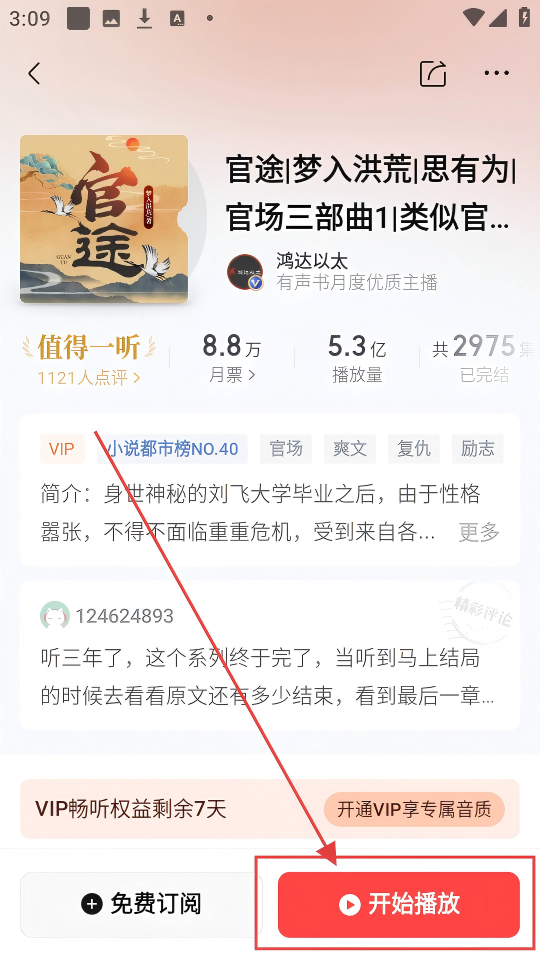 1、在《官途》详情页,能看到播放量等信息,点击【开始播放】就能收听啦。